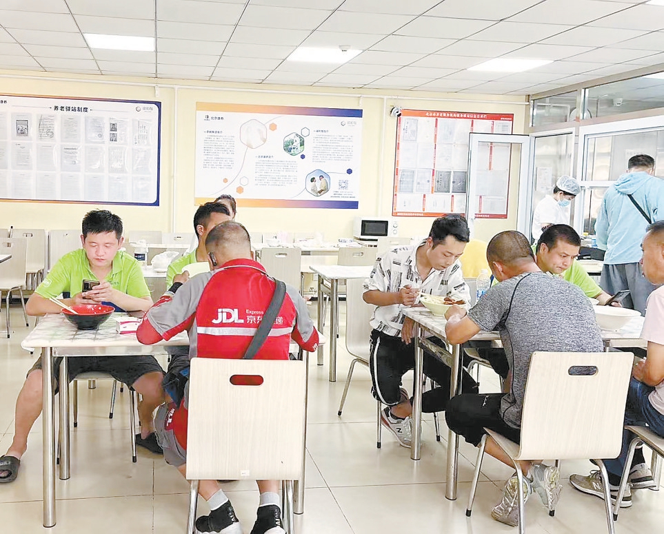 附近中午12点,大厅里的老东谈主越来越少,食堂的贸易却仍旧火热,一批批在近邻上班的年青东谈主陆续前来就餐。“差未几每天来这里吃饭,转眼还有好多共事要来。”点了一份葱爆肉和炒白菜的31岁快递员李先生说。从中午12点到下昼1点,食堂大厅里坐着的实在齐是近邻的房屋中介、外卖骑手、快递员和部分企业职工。